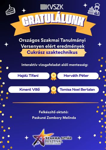 Több szakmában is megmutatták tudásukat diákjaink az Országos Szakmai Tanulmányi Versenyen. 🏆 Szívből gratulálunk a cukrász szaktechnikus tanulóinknak és a felkészítő oktatóinknak! 👏